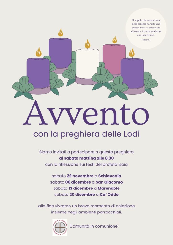 Accogliamo l’invito da parte delle parrocchie di San Giacomo, Marendole, Schiavonia, Ca’ Oddo a partecipare alle Lodi mattutine nei sabati di Avvento (ore 8:30), accompagnate da un breve commento al Libro di Isaia a cura del parroco don Alessandro. Qui di seguito tutte le info.